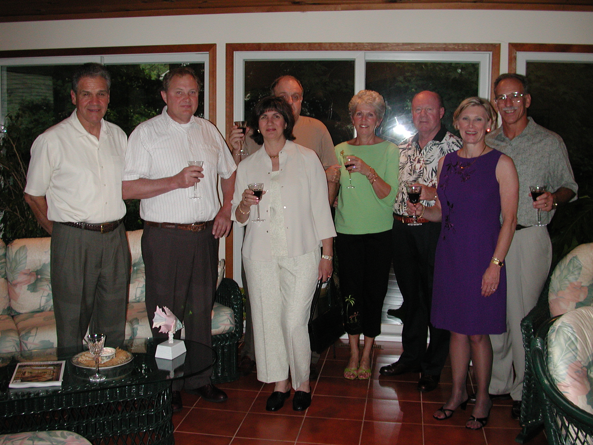 We had a little pre-reunion warmup at Don Wood's house, where the reunion committee downed a bottle of very fine 1961 wine provided by Ralph Pepe [Salesianum '61]. (The people pictured below are -- left to right -- Ralph Pepe, Nick Cupery, Rose Pepe, Jack Meeks, Henrietta [Davis] Apsley, Steve Apsley, Carol Wood, and Don Wood.)